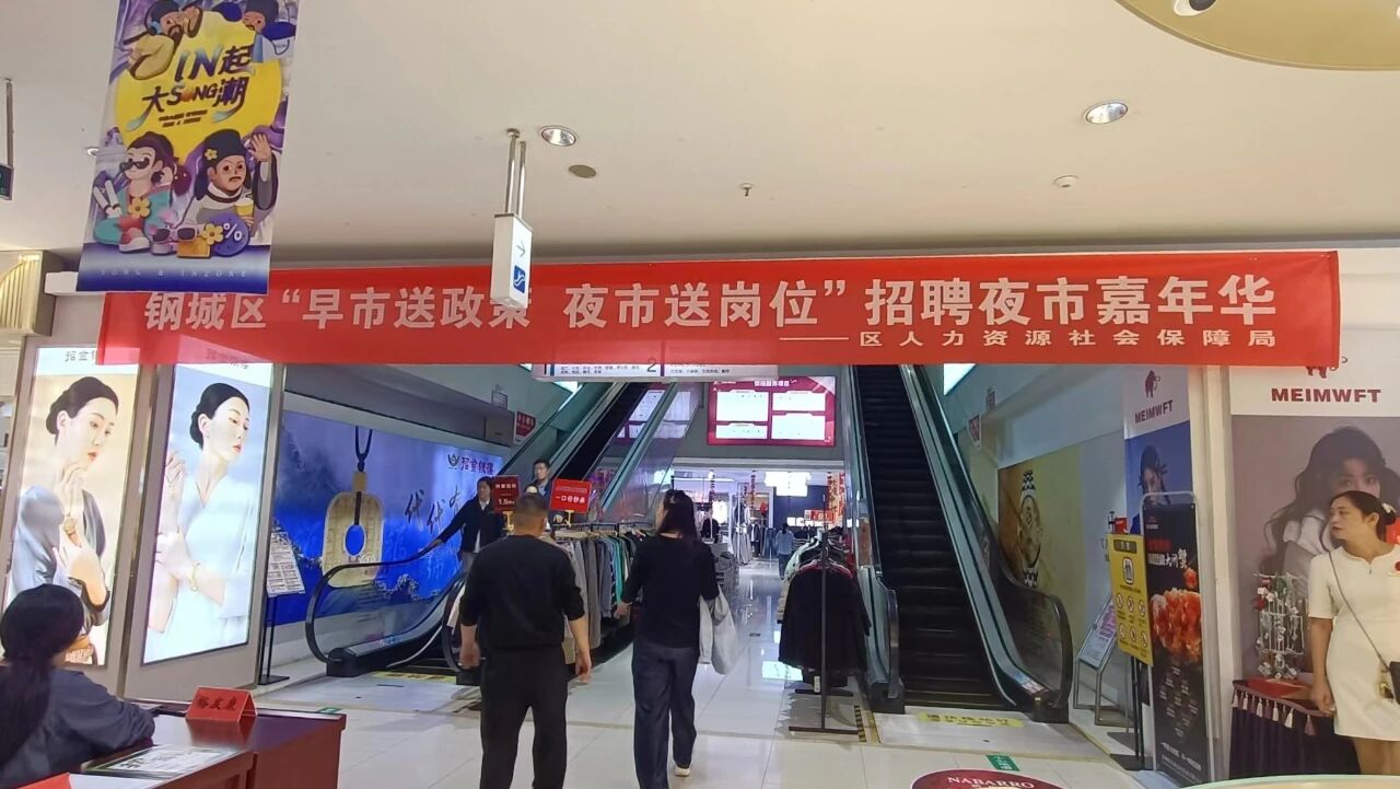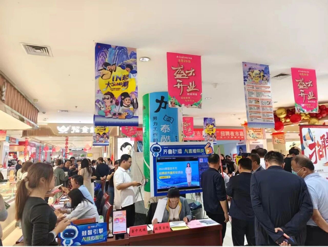 活動(dòng)現(xiàn)場(chǎng)亮點(diǎn)紛呈。企業(yè)展位融入商場(chǎng)消費(fèi)場(chǎng)景,HR化身“夜市攤主”,求職者穿梭其間輕松交流,匯鋒傳動(dòng)公司HR坦言:“半小時(shí)就面試了10余名求職者,招聘夜市氛圍讓求職者更愿敞開(kāi)心扉?!笨萍假x能更添活力,AI數(shù)字人主播同步直播帶崗,線上簡(jiǎn)歷投遞量可觀,直播間在線觀看人數(shù)達(dá)9300余人次,投遞簡(jiǎn)歷量215份。政策與消費(fèi)福利雙重加碼,設(shè)置“政策宣傳專區(qū)”,發(fā)放就業(yè)補(bǔ)貼、技能培訓(xùn)等政策宣傳冊(cè),銀座商城同步推出“求職滿減券”,讓求職者“邊逛邊求職”,享受零售折扣,有求職者點(diǎn)贊:“這才是招聘該有的溫度!”